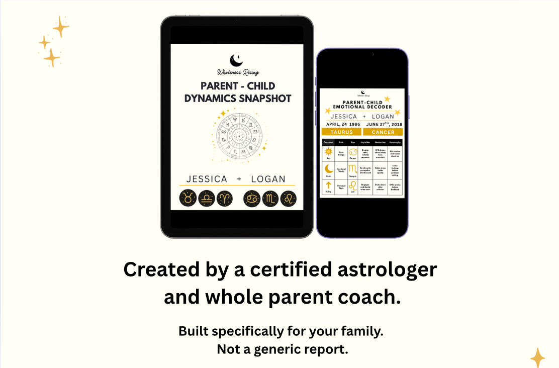 1. Share birth details for you and your child (Just date, time if known and place)2. Individual decoding of your emotional wiring + stress patterns using your Sun + Moon + Rising elemental profile paired with actionable tips for your unique dynamic and common stressful parenting moments based on your child's age.3. You receive a highly designed 6-page PDF within 24-48 hours straight to your inbox.Simple, clear, and created just for you and your child.